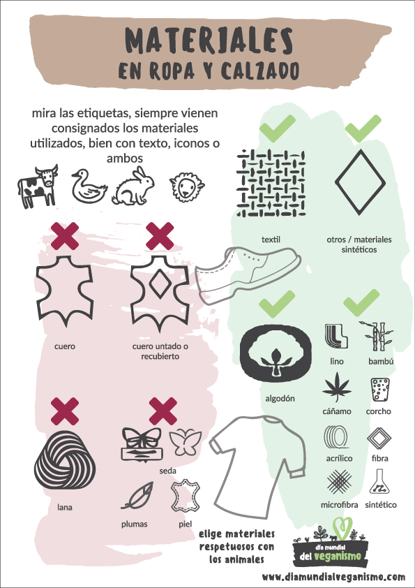 – Ropa vegana: algodón, lino, poliéster, acrílicos, franela de algodón, fibras sintéticas, pieles sintéticas, plumas sintéticas, nailon, rayón, sarga, viscosa, plástico reciclado, microfibras, primaloft, thinsulate, gore-tex, polartec wind pro, thermolite.